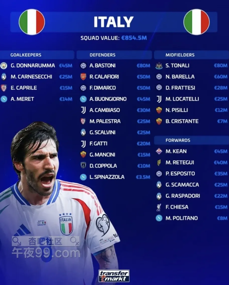 [|足球快报] 意大利国家队身价:巴斯托尼、托纳利8000万欧并列最高 |