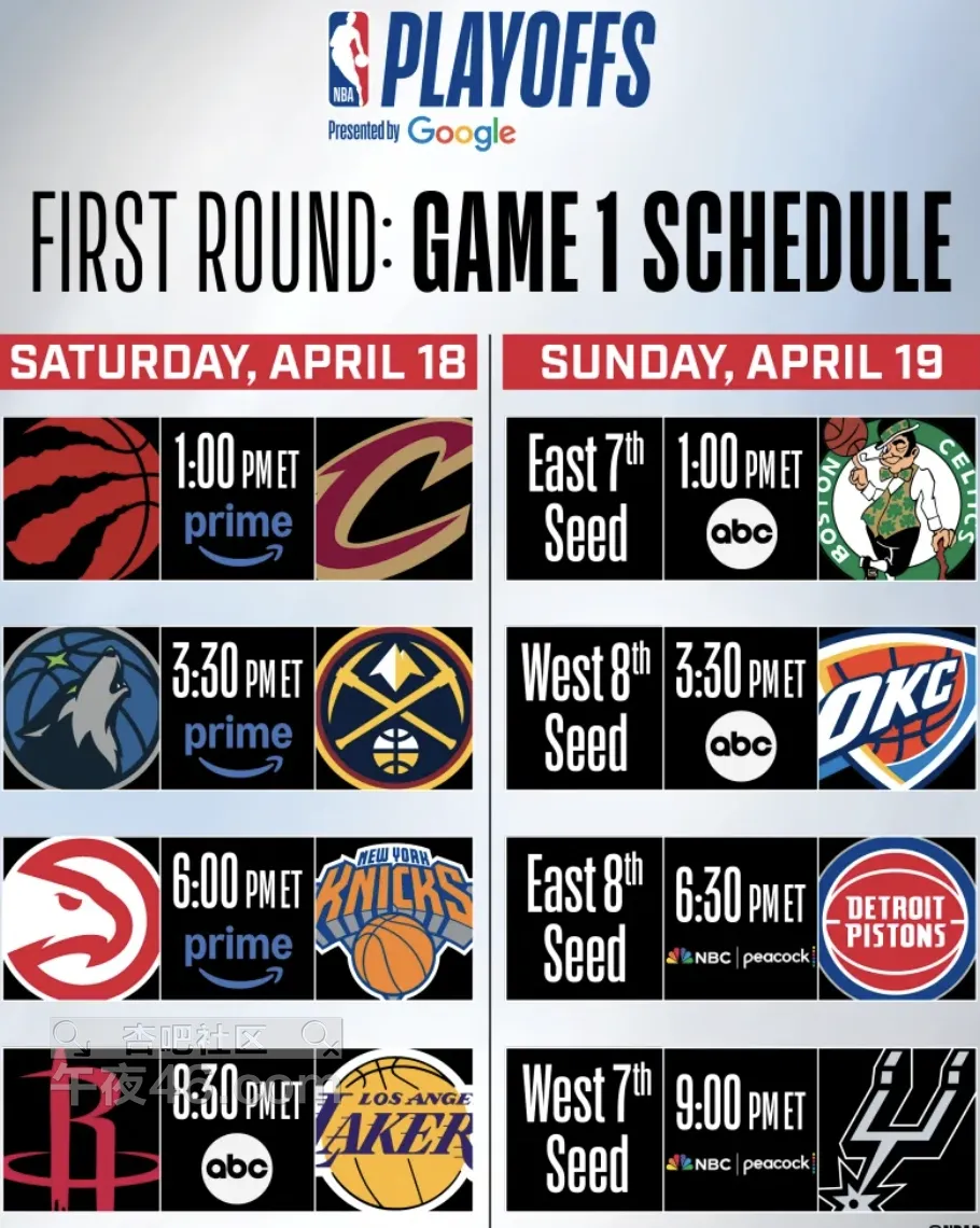 [|篮球赛事] 首轮赛程:19日3点半掘金VS森林狼,19日8点半湖人VS火箭 |